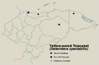 This beautiful toucanet is generally uncommon to rare in Central America and ranges from Honduras, east of the Honduran Depression, to S.America and is typically difficult to find. All known sightings of this species come from broken terrain within lowland, humid rainforest.