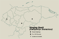 This quail is uncommon in Honduras, existing primarily in montane habitats above 800m. In Honduras it has been recorded only in the vicinity of La Tigra N.P. and Sierra de Agalta N.P. (Monroe, 1968). and in April 2008 in Celaque N. P. Gallardo (et.al). With patience it is fairly easy to observe in La Tigra N.P. especially along the trail that begins to drop down to the San Juancito side. It is typically found in pairs of small groups. Its loud, waivering voice can be heard from afar.