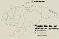This bird can only be seen, in Honduras, on the island of Guanaja. There, it is fairly common in the broadleaf forest that rings the lower parts of the island and seems to have been little affected by Hurricane Mitch. It can be found singly, in pairs and occasionally accompanying mixed flocks.
